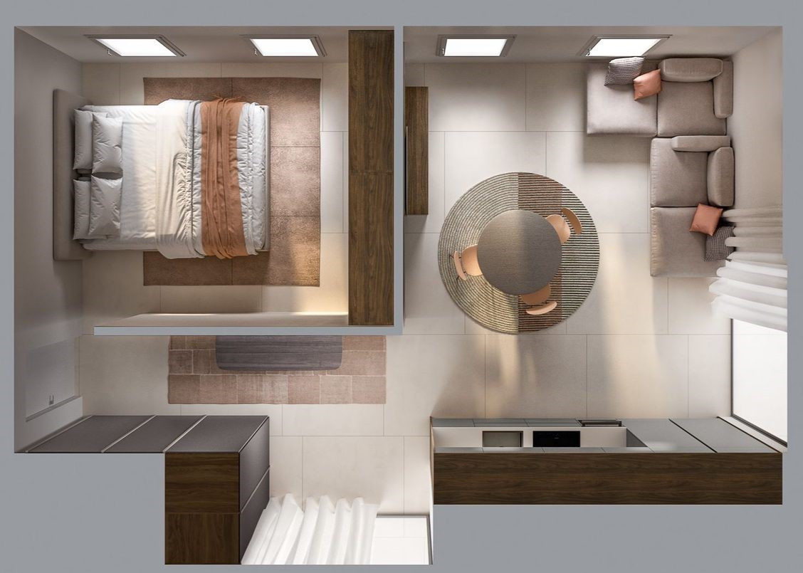 Bear in mind that the minimum width necessary to arrange a functional and ergonomic linear kitchen is at least 350 centimetres.