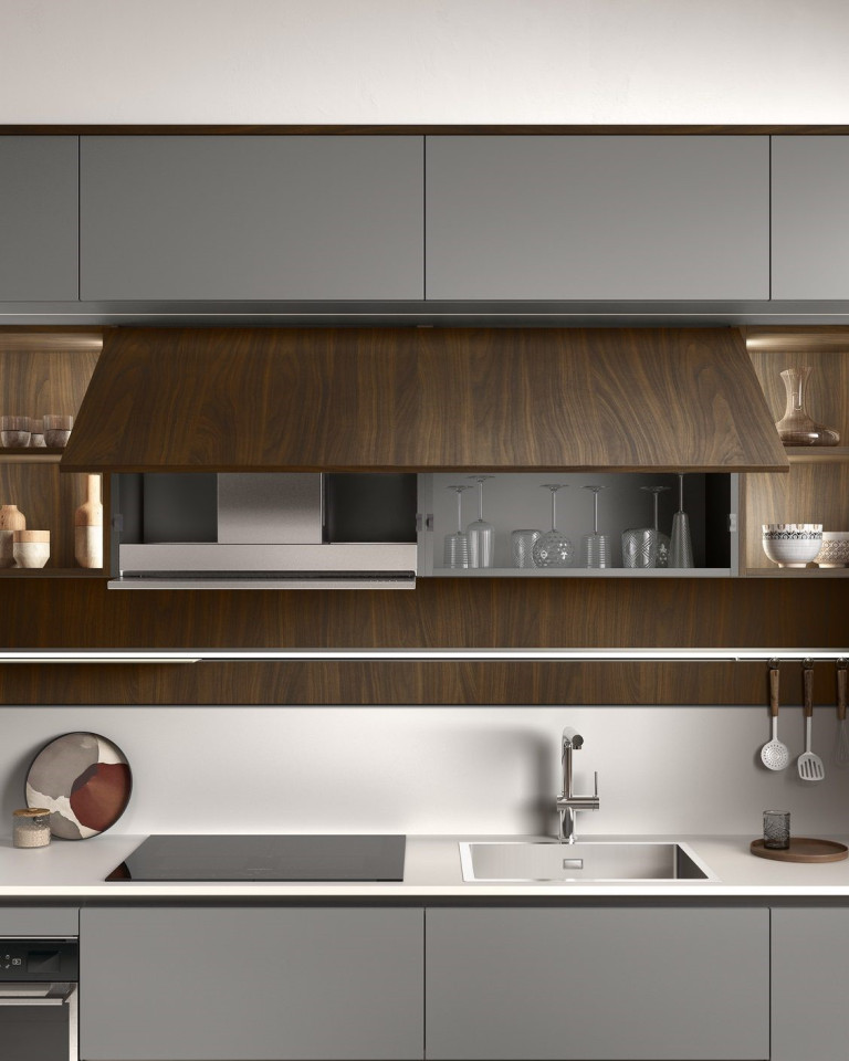 But practicality means above all functionality of use because a linear layout enables you to move easily between the various areas of the kitchen, for example from the hob to the larder, in just a few short steps.
