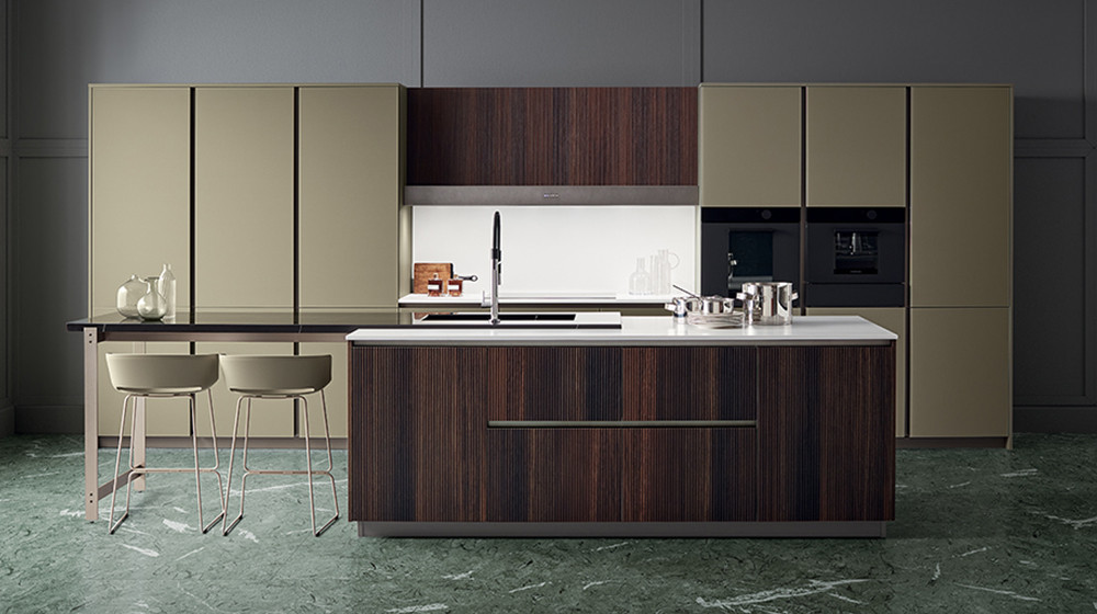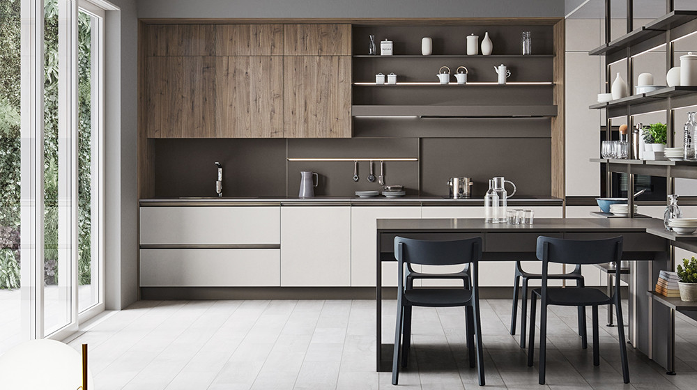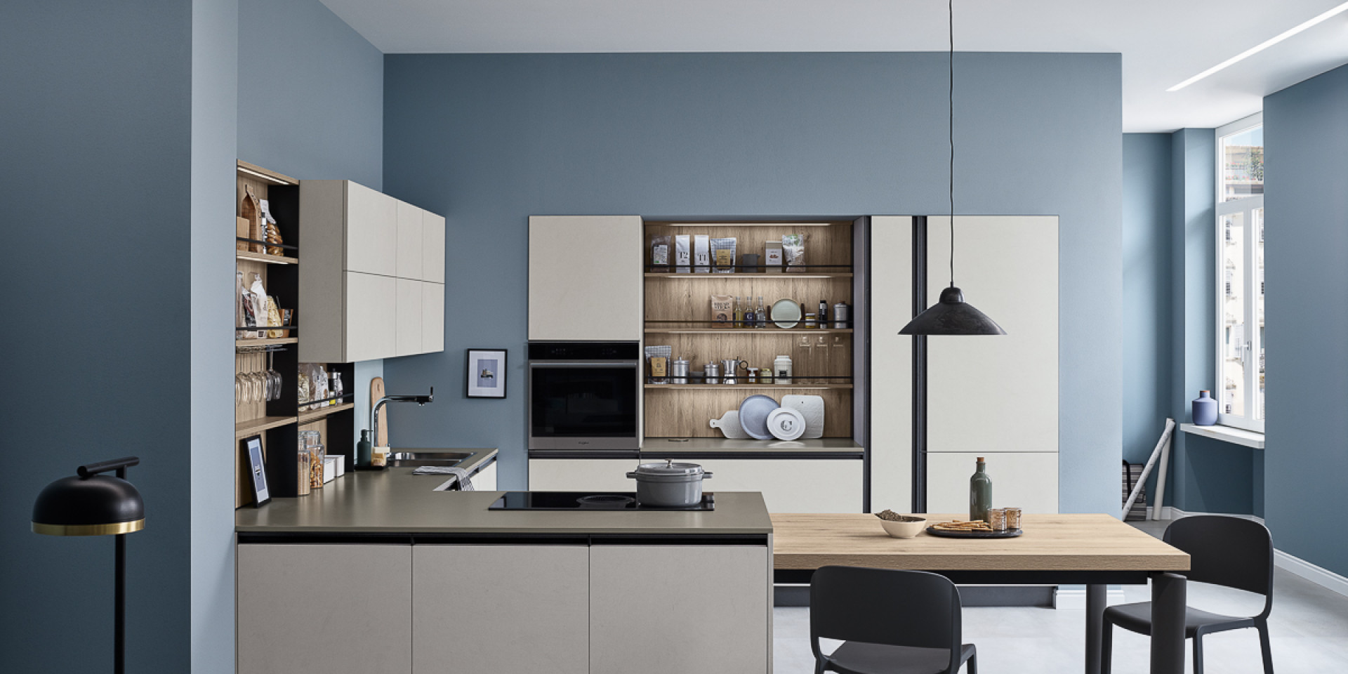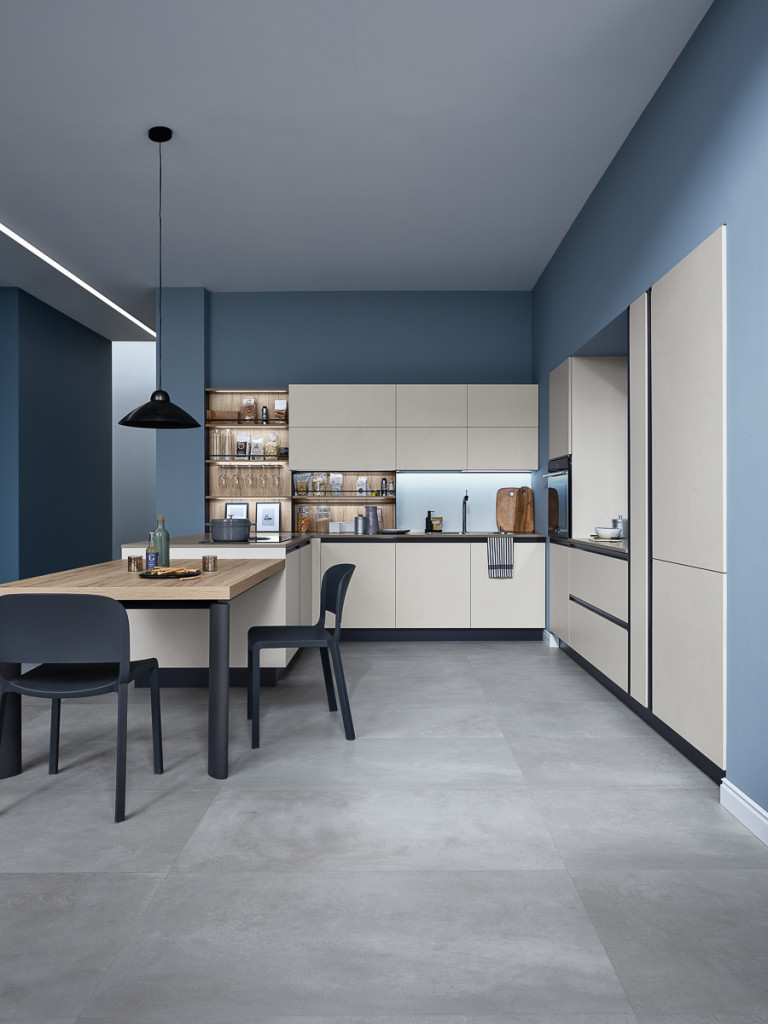 A peninsula is a characteristic element of “L”- or “C”-shaped kitchens and can house various modules: worktop, hob and sink, space for doors, drawers, deep drawers and open shelving and of course it can also act as a dining table or snacking area.