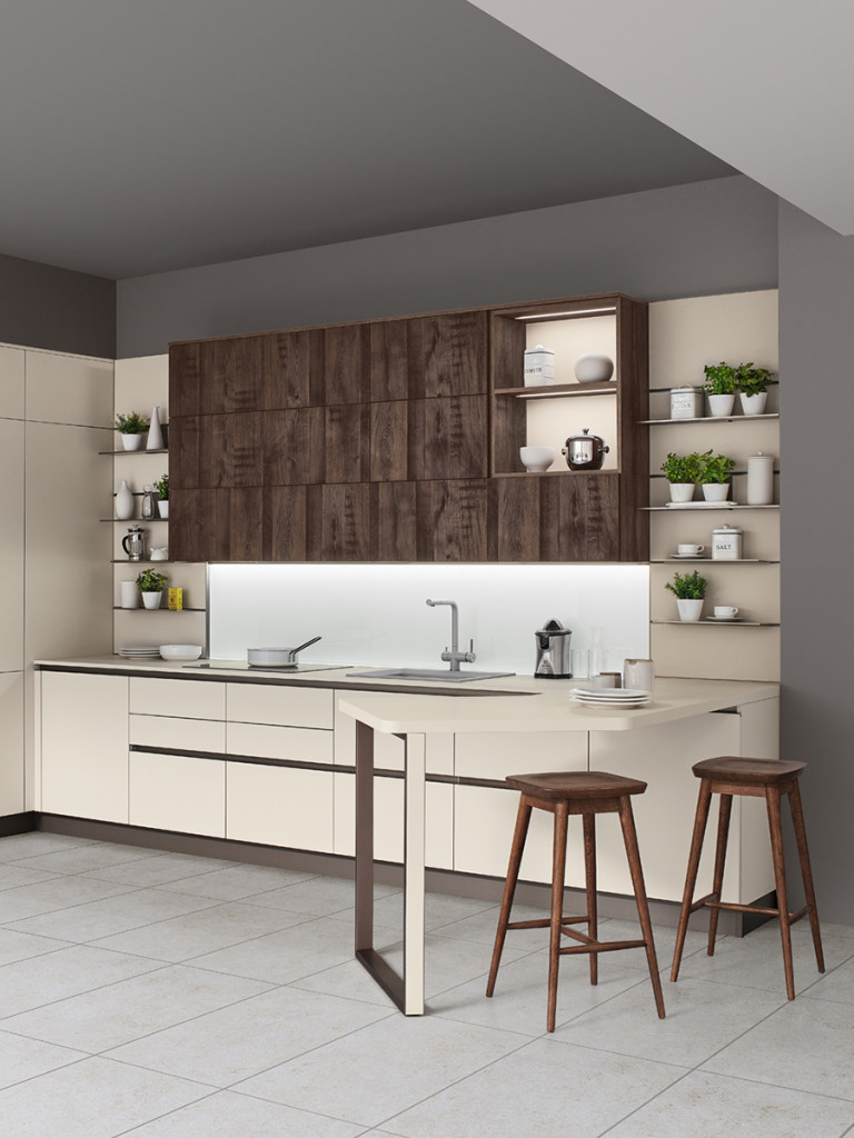 There isn’t always time to set the kitchen table properly, especially on weekday mornings: a table adjacent to the worktop and hob will make your breakfast or lunch break quicker.