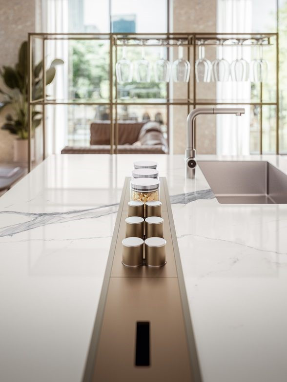 Questa conformazione ha infatti il pregio di una grande flessibilità progettuale: l'isola diventa il fulcro operativo e visivo dell'ambiente e il resto dello spazio, a differenza di quanto avviene in una cucina con penisola, le si sviluppa attorno attraverso colonne e basi con pensili (ma sono possibili anche cucine senza pensili).