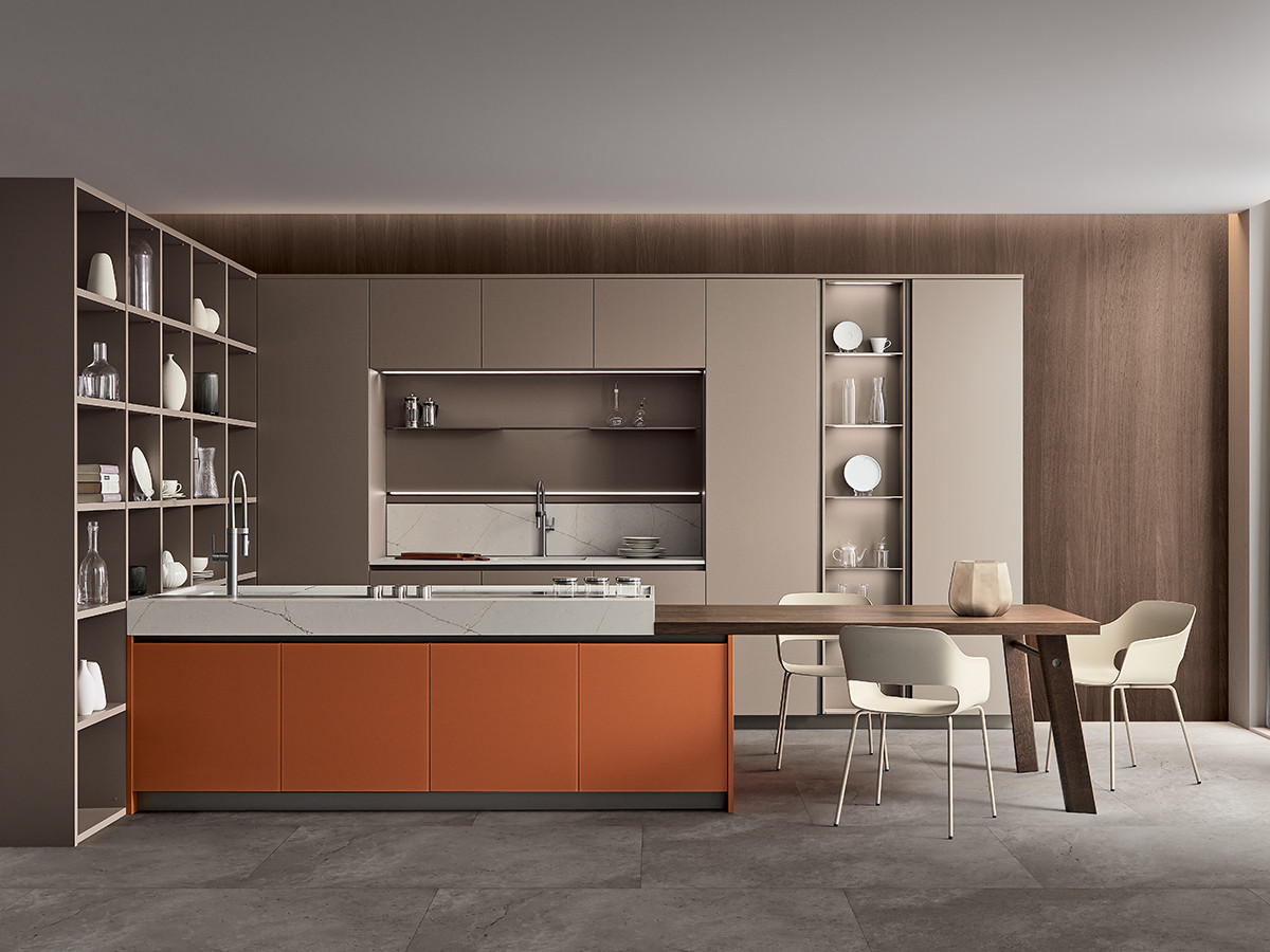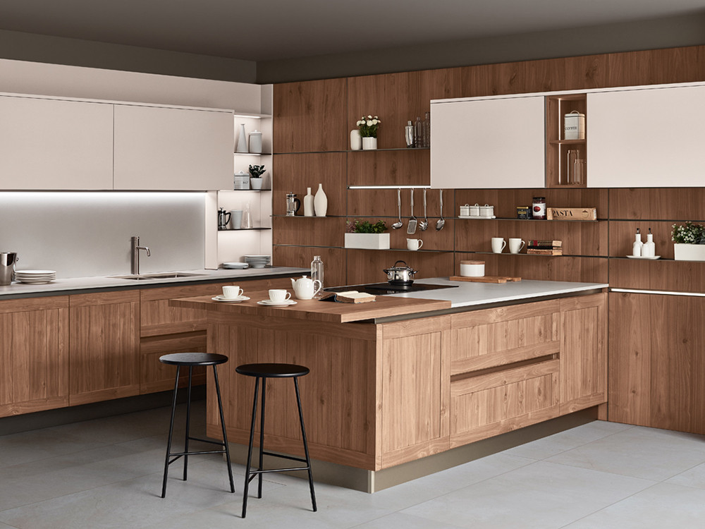 La penisola è un elemento caratteristico delle cucine a “L” o a “C” e può alloggiare moduli diversi: piano di lavoro, piano cottura e lavello, spazio per contenere ante, cassetti, cestoni e vani a giorno e naturalmente può fungere anche da tavolo da pranzo o zona snack.