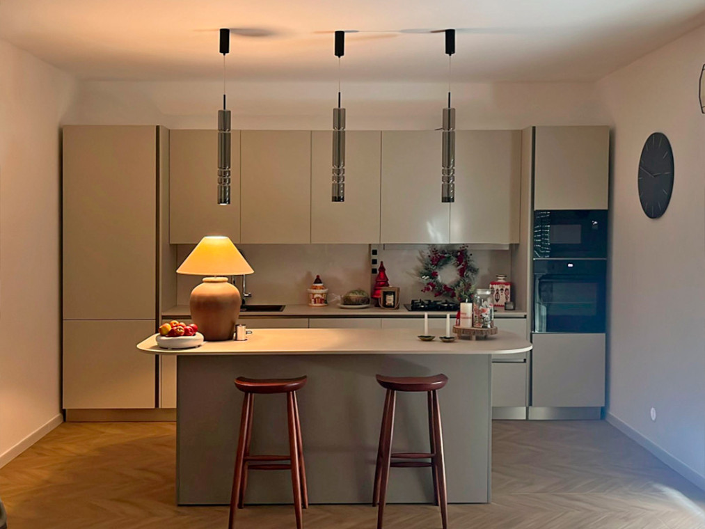 Una nuova casa, una giovane famiglia e una nuova cucina dalle linee pulite e minimali , dai colori...